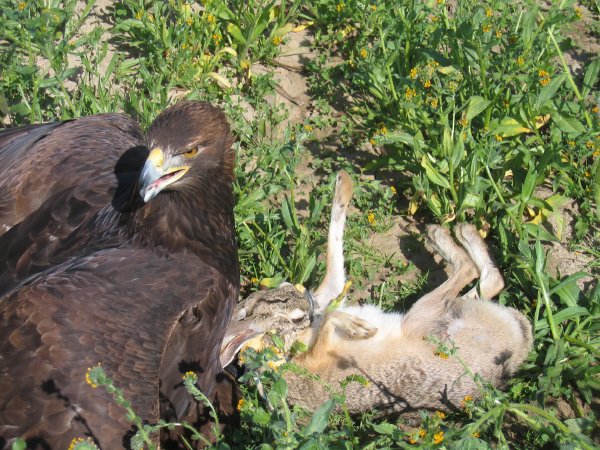 I drove over to a new field (it’s new for me to actually hunt in but I have known about this field for years). I never wanted to hunt JH in it because he would not tolerate the massive amount of humanity that surrounds this small field. Hunting in this field all I can see is a mass of manmade ugliness McDonald’s, Carl’s Jr, Burger King, Denny’s, two gas stations, ITT Tech School of Higher Learning, Best Western Hotel, a glass factory complete with railroad cars and a small electric power plant. There’s more but I think I made my point. MM does not seem to be bothered at all so I can fly this field which is teaming with jacks. I wish I would have weighed MM because he seemed just a little off this morning; flew fine but not quite 100%, maybe 95%. This field is great because from the very first step into the field you can flush a jack rabbit, which is what happened. All I could see was the fiddle neck parting as the jack ran off. MM was closing fast and went in but missed. I got 3 more slips where I thought he could have caught one but didn’t, and had just about covered the entire field. I was going down the last stretch when a jack flushed and headed right for the glass factory fence. I was sure that MM was going to slam into the fence, he was flying with such power and intent. Just as the jack got to a gravel road that runs along the front of the fence it turned right and headed down the road. MM flew harder, recognizing his chance, and closed on the jack which then freaked out and turned left into the fence, looking, I’m sure, for a hole to get through the fence. MM slammed into the jack as it went under the tumbleweeds and trash that has accumulated at the base of the fence and caught #3.