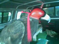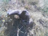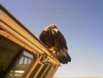 The weather has been great, warm breezes with just a slight hint of fall in them. Widow has been doing a lot of flying but not much soaring. She is in very good shape. Today, as an example, she flew for more than an hour and a half, flying back and forth, ¼ of a mile one way, slope soaring and looking for me. I spent a great deal of time hiding from Widow which was forcing her to fly a great deal. At one point I went down on the valley floor and sat on a log that fell off a cottonwood tree that we call the ant tree and for good reason. I temporarily forgot why this tree was named the ant tree and within 2 minutes my pants were crawling with biting ants! So, with me jumping up and knocking ants off my clothes, Widow found me and came over the tree thinking that I was surely calling her in with all my gyrations. Then Widow went way back up on the hill and was out of sight for some time. I took that opportunity to sneak back to my truck looking for a cool drink of water. I was quite sneaky about it too, darting from cover to cover, never exposing myself for more than a brief second or two, then holding dead still, checking to see if Widow was back in sight, and then exploding from cover only to slide into another clump of cover like I was stealing home plate in a baseball game! I reached my truck, darted around the back side, and opened up the rear door. Finding a bottle of water, I sat on the step taking a long cool drink and. surprise, Widow landed on the open door of the truck shell looking at me! You know, it’s pretty hard to hide from an eagle they’ve got those eagle eyes and everything! I fed her up..