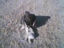 I turned and headed back down the east side of the field and up jumped another jack, heading down the middle of the field. JH launched with power but, because of the way I was standing, he had to take off in the opposite direction and had to circle back around to get after the jack. He was at full after-burn and his opportunity was closing, as the jack rabbit was now going for the fence! JH came barreling in like a freight train and the jack jumped to the left, then to the right, kicking up dust both times. JH footed the jack in the head and his momentum caused him and the jack to do a complete somersault. Dust, straw, weeds and all went up in the air. I was pacing off the 65 yard flight when I heard “Did you see that!?†and, looking in the direction of the voice, I saw two truck drivers coming up to the fence to get a closer look. JH was not happy. “Hey, what kind of bird is that?†“A harris hawk,†I said. “Yeah, we see other guys in this area with birds; your bird is much bigger than theirs.†“Yeah, I know, they have wimpy little girlie birds.†I know the falconers that fly here and it will drive those guys nuts thinking that someone is out here with a huge harris hawk, until they figure out who it was.