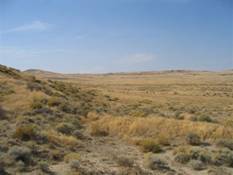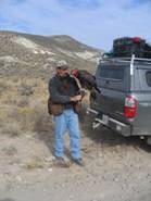 We back-tracked our way down to where the road had split and took the road off to the right. Winding our way through the sage covered hills the landscape quickly took on a completely different look. Most noticeably, the sage brush was shorter, knee high or less, where as before the sage brush was up to my waist or sometimes up over my shoulder, way too high to fly. Looking off to the right I could see a nice area with some sage but mostly grass and, down in the draw, sage brush as well, so a nice mixture. We decided to give it a go and fly JH. Walking out into the field we could see jack signs everywhere and JH was very interested..again, reading some kind of clue. Cordi was down in the draw and I was up walking on the edge of the open grass. JH launched on something, flew all the way across the draw and landed on the far bank. He no sooner landed and a jack rabbit exploded, and I do mean exploded, from right in front of me and blasted down into the draw. JH saw it and launched off the bank, coming back across the draw. The jack rabbit instantly stopped under a sage bush. No longer able to locate the jack rabbit, JH pulled off and turned back to the bank. The jack took off and was gone! Other than the road kill jack rabbit I had seen, that was the closest we got to a jack rabbit the whole trip. The one that had flushed was a sage colored grey, almost blue color, very different from the valley jacks out in California I’m used to seeing.