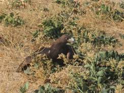 I went over to the speed field for no other reason than it is directly across the street from the sewage plant. Fortunately there is no smell there. The way this field works is I need to walk quite a ways in before there is any real cover but jacks can pop up from anywhere. Really, the best flights are when they pop up out in the open ground..that makes for very fast flights. As is often the case when I fly this field, a large truck came by, saw me, and pulled over to watch. A jack flushed, running from left to right, going in the direction of the road and the truck. JH exploded off my fist and was instantly cranking after this rabbit. The flight came right at the truck driver. Imagine a jack rabbit running in a field that does not have one blade of grass or pebble on it, totally clean, just hard packed sand, and a golden eagle coming in on the jack rabbit at tremendous speed, over-taking the rabbit in a spinning dust cloud, all fifty feet from where you’re sitting. Heck, that’s better than Animal Planet. The driver waved and drove off. Gee, he could have flipped me a $20 as a tip. JH caught his third jack of the day in another speed burner out in the open part, very much like the flight I just described.