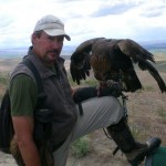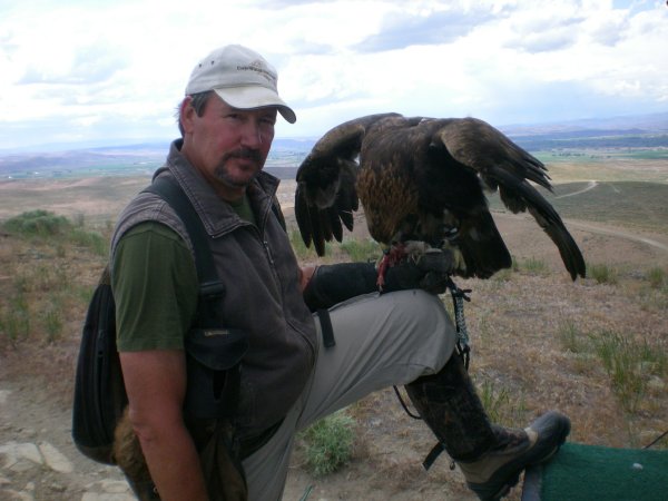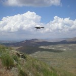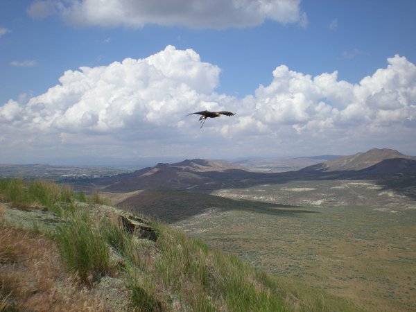Widow has been grounded for several days because of high winds but today Cordi and I took her up on the mountain to fly. What a spectacular day — huge clouds with brilliant blue sky. Widow did not disappoint us. She flew for more than an hour, at times going more than a mile out over the valley and going up to a speck. She stooped on something out in the middle of the open sage and when I got to the cliff edge I could see her on the ground with a wild female coming in on her. They fought over something and the wild bird left. I started to go down the very steep mountainside and at the halfway point Widow flew off. I continued down and looked around but could not see any sign of a kill. Widow flew off, caught a thermal, and went back up into the clouds. I called her down several times to the lure on the side of the mountain. Just great flying on her part.